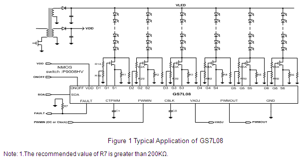 The GS7L08 is a LED backlight controller with six independent linear, programmable current regulators. The output current of each regulators can be respectively set by an external current-sense resistor.